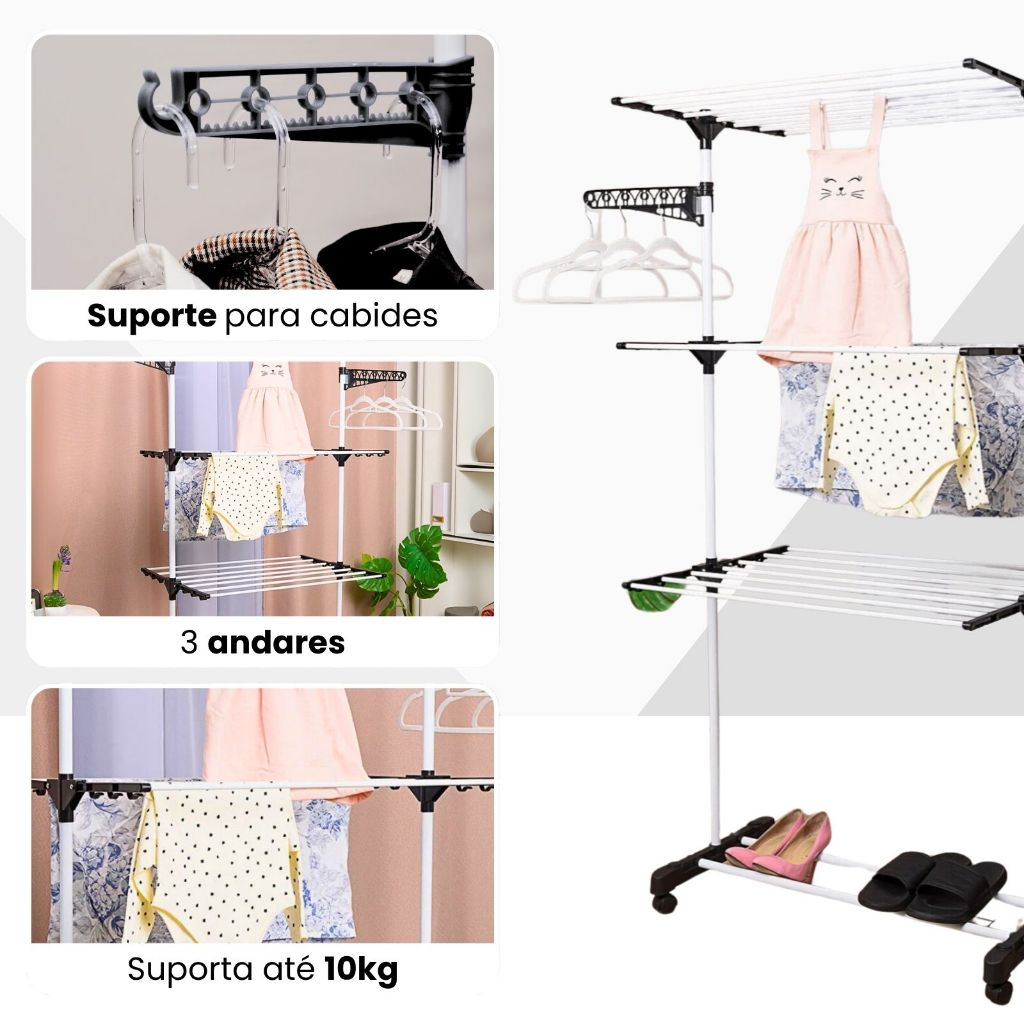 - 3 Andares de Hastes em Aço: Permite distribuir roupas pesadas, como jeans e casacos, enquanto as roupas leves podem ser penduradas em cabides na parte lateral e superior, evitando amassados.