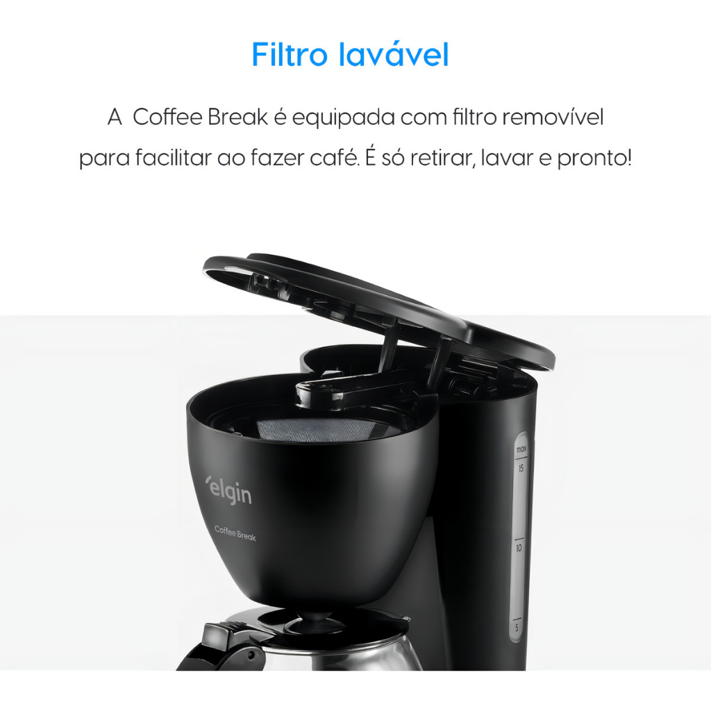 Cafeteira Elétrica Coffee Break é a escolha perfeita para quem valoriza um café fresquinho e de qualidade, sem abrir mão da praticidade e eficiência. Com capacidade para até 15 xícaras, ela é ideal para famílias maiores ou para servir várias pessoas durante o dia.